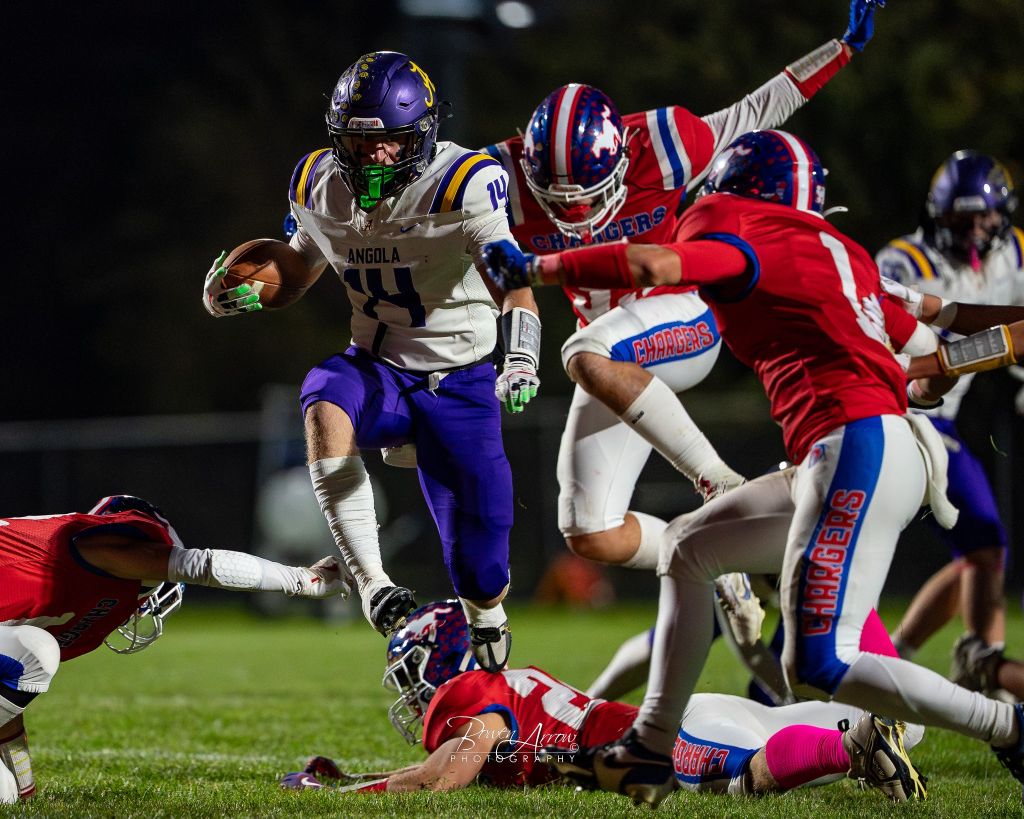 (LIGONIER) – Down 20-7 late in the game, the Angola football team scored twice in the final eight minutes as they rallied to beat host West Noble 21-20 in their Class 3A Sectional 26 Semi-final game. Hawk Hasselman had 28 carries for 148 yards and 3 touchdowns on the night. West Noble ends the season at 8-3 while Angola is now 6-5.