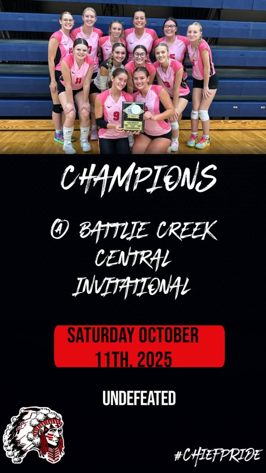(BATTLE CREEK) – The White Pigeon volleyball team went to B.C. Central for the Lady Bearcats Invitational and came away with first place on the day. The Lady Chief went undefeated in pool play and then in the Gold Finals beat Hastings for the championship. Kenlee Schrader had 11 kills, 21 digs, 25 assists and 9 aces for White Pigeon. Addison Smith added 62 digs, 7 assists and 4 aces while Sadie McDaniel had 16 kills, 3 digs, 3 assists and 2 blocks. Grace Bontrager had 9 kills, 13 digs and 3 assists on the day.